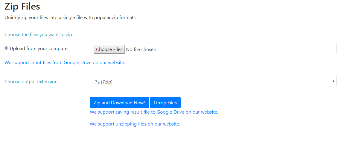 You can choose multiple files at once (maximum 20MB) to upload and zip.